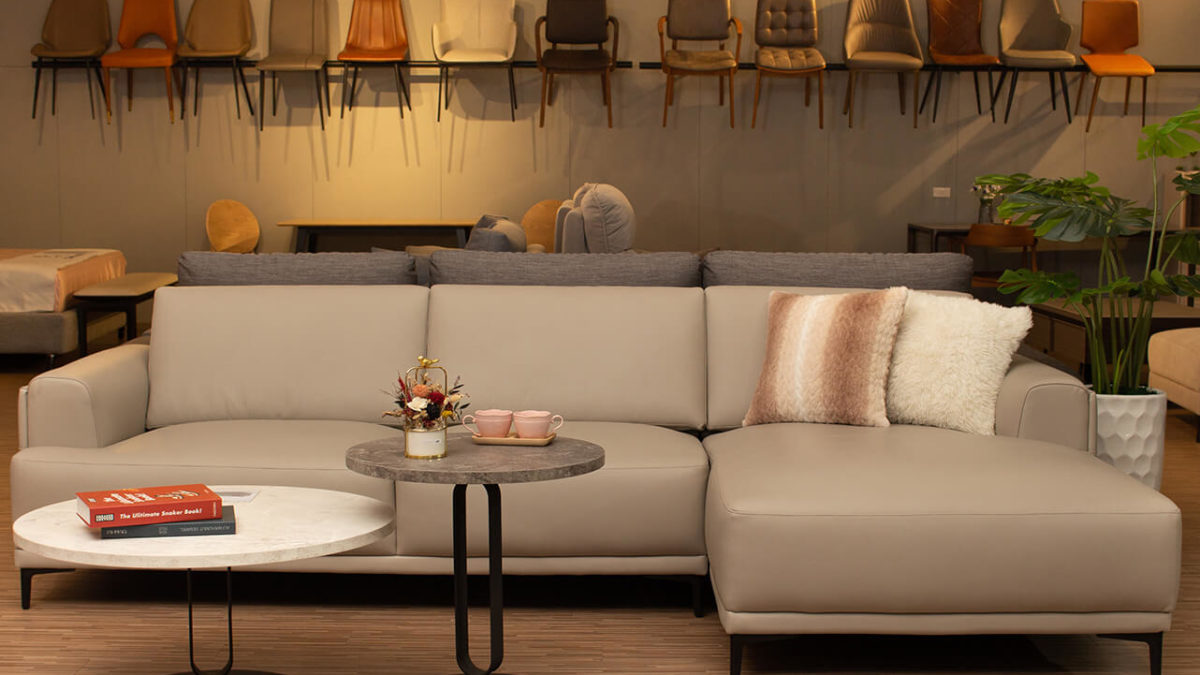 博鎧台中家具門市共有兩層樓展示空間,展示將近20組大、小沙發、近15組床組、床墊款式、近50張餐椅、單人休閒椅、吧檯椅、各式材質餐桌、多功能茶几、床頭櫃、邊桌、邊几、椅凳,也有點綴搭配床尾椅、衣帽架、收納櫃。各式家具類別展示陳列,為了讓參觀客戶更能感受實際使用情境,也會建議客戶沙發若這樣配色,會適合什麼樣的茶几...
